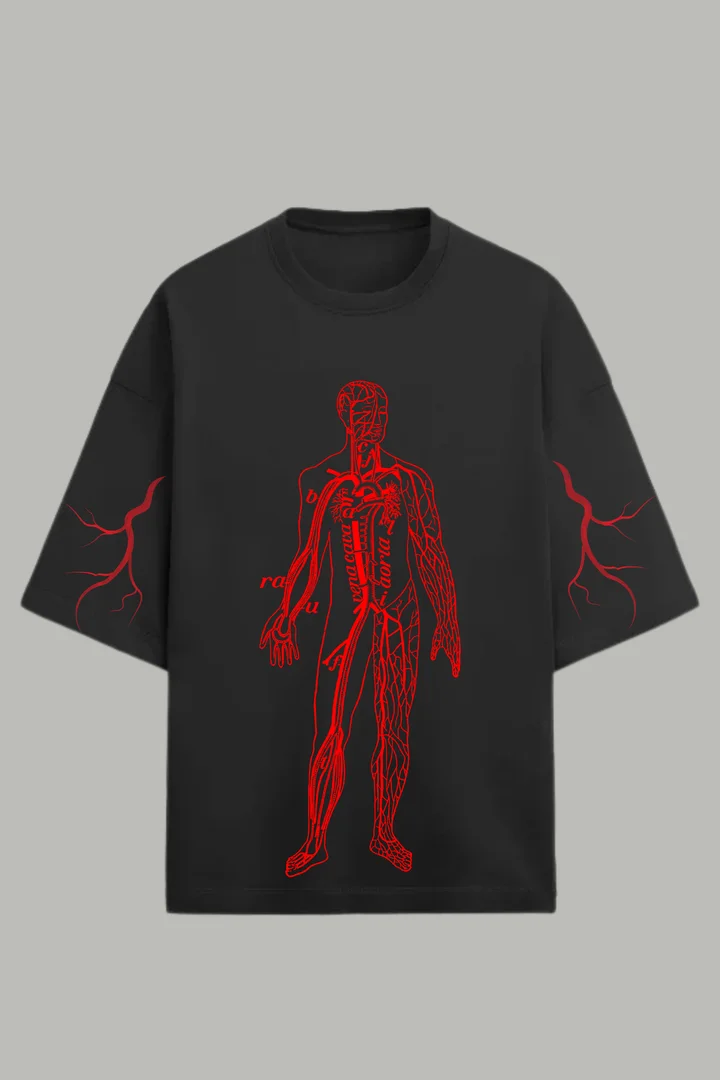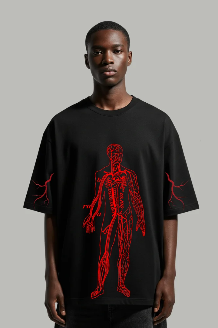 This piece blends dark-art aesthetics with everyday comfort — featuring a striking red anatomical body print on deep black fabric. Designed for streetwear lovers who crave originality, this tee delivers both attitude and comfort in equal measure.