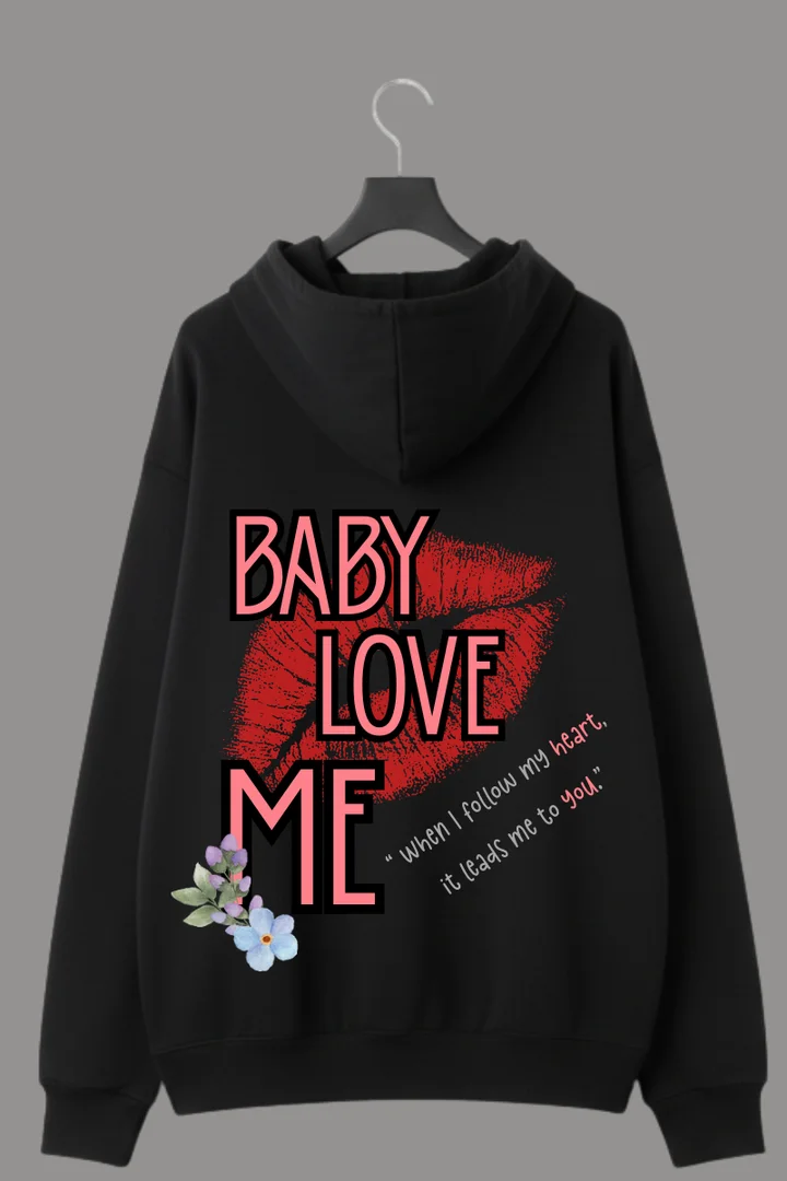 The large typography “BABY LOVE ME” instantly grabs attention. It’s bold yet tastefully done, with a clean outline effect that makes the words pop without feeling too loud. Behind the text is a textured red lip imprint — symbolic, passionate, and impactful. It adds a sensual dimension and reinforces the emotional intention of the design.