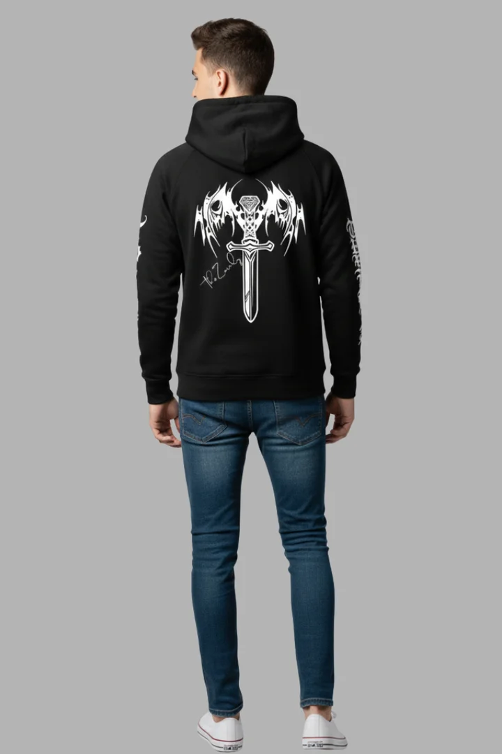 The reverse side of the hoodie carries the main Unleashed Fury graphic. This design is built to be a statement as you walk away. [Placeholder Detail: The central back graphic is a highly detailed, large-scale print—possibly featuring an intricate abstract geometric pattern, a stylized mythological beast, or a bold typographic call to action—centered perfectly for maximum visual impact. The print quality is guaranteed to be high-definition, using advanced screen printing techniques to prevent cracking or fading, ensuring every line and shade stands out vividly against the deep black canvas.]