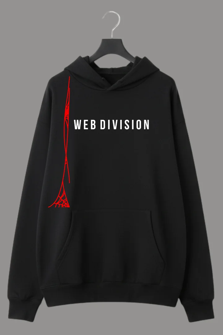The defining characteristic of this hoodie is the graphic artwork. The front features a vertical red line artwork inspired by web-like geometric shapes—symbolizing strength, creativity, and connection. The minimal “WEBDIVISION” text in white completes the futuristic look.